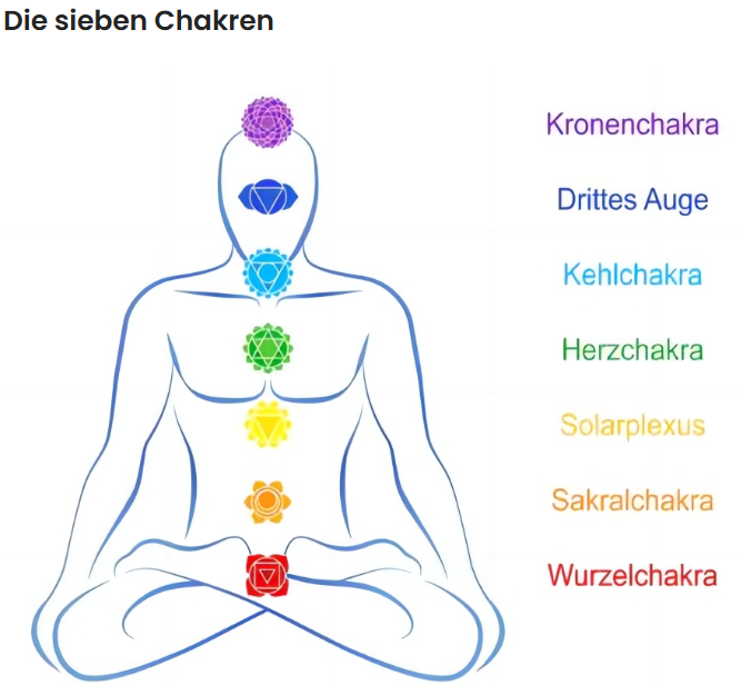 - Kronenchakra (Violett): Liegt am oberen Ende des Kopfes und ist mit Bewusstsein und spirituellem Erwachen verbunden.