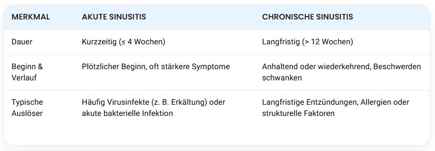 Je nach Dauer der Symptome unterscheidet man in der Regel zwischen akuter und chronischer Sinusitis.